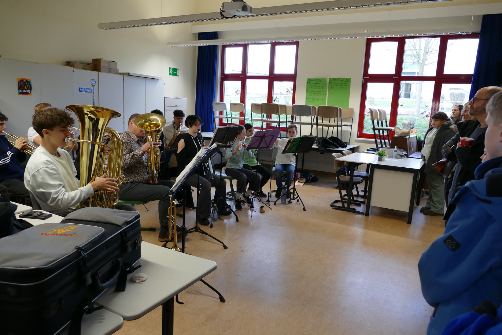 Auch die Verwaltung und das erweiterte Lehrerzimmer bieten jetzt bessere Arbeits- und Aufenthaltsmöglichkeiten. Mobile Laptop-Lösungen verbessern für die Lehrkräfte das Arbeiten in ruhiger Atmosphäre in einem kleinen Arbeitsraum oder im größeren Lehrerzimmer am Platz der Wahl.