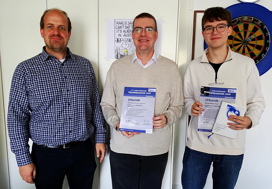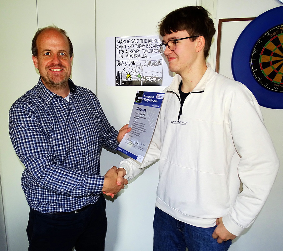 Der MINT-Fachbereichsleiter Dr. Jan Hofmann beglückwünschte Ansgar zu diesem hervorragenden Erfolg und wünschte ihm für die 2. Runde alles Gute. Thomas Wilhelm Schwarzer, Wettbewerbsbetreuer Physik, überreichte dem Olympioniken als Preis das Buch „Einsteins Traum – Expeditionen an die Grenzen der Raumzeit“ von Stephen W. Hawking.
