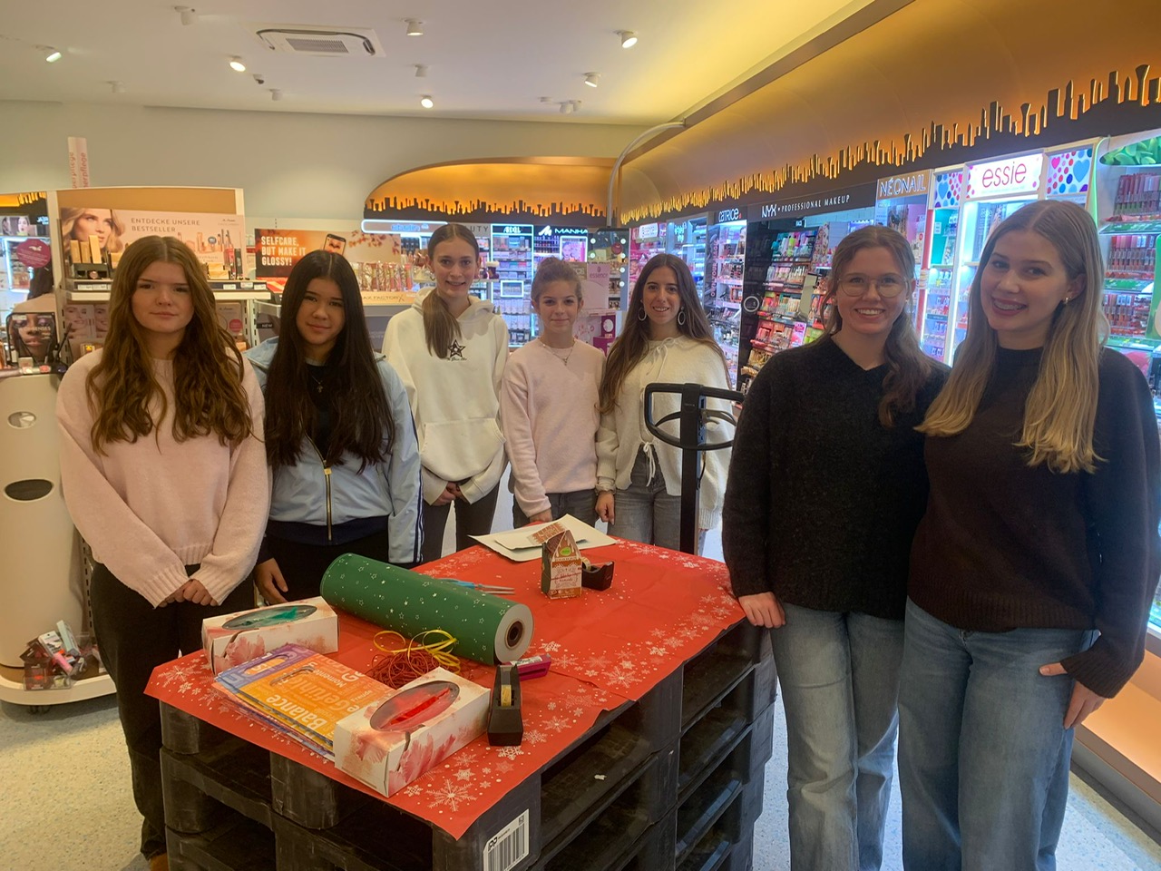 Doch nicht nur Kinder sollten bedacht werden. Im Rahmen der lokalen Aktion „Wünsch dir was“ erfüllte der Kurs auch die Weihnachtswünsche der Bewohnerinnen und Bewohner des örtlichen Seniorenheims. Die Wunschzettel wurden zuvor im DM-Markt ausgehängt. Dort packten die Schülerinnen und Schüler die Geschenke direkt vor Ort ein – vom Lieblingsduschgel bis zur warmen Wolldecke. Viele Kundinnen und Kunden blieben interessiert stehen und lobten den Einsatz der Jugendlichen, die mit Freude, Geduld und Kreativität bei der Sache waren.