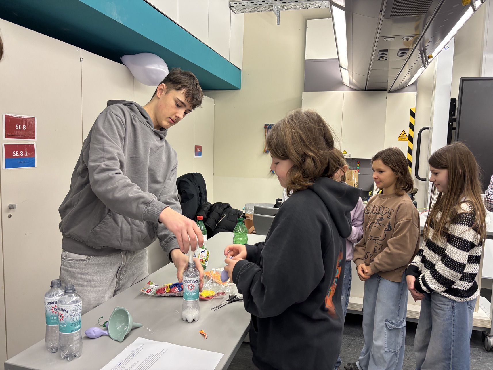 Am letzten Schultag vor den Weihnachtsferien erhielten naturwissenschaftlich interessierte Schülerinnen und Schüler der Jahrgangsstufen fünf bis sieben die Gelegenheit, gemeinsam mit dem Physik-Leistungskurs der Jahrgangsstufe zwölf zu arbeiten. In altersübergreifenden Gruppen führten sie Experimente durch und setzten sich anschließend mit den theoretischen Hintergründen auseinander. Der Austausch zwischen jüngeren und älteren Lernenden sorgte dabei für eine besonders motivierende Arbeitsatmosphäre.