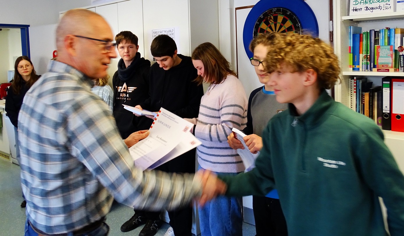 Der Wettbewerbsbetreuer Thomas Wilhelm Schwarzer gratulierte den Schulsiegern zu ihrem Erfolg und wünschte ihnen für die Anfang März in Butzbach stattfindende Kreisrunde viel Erfolg.