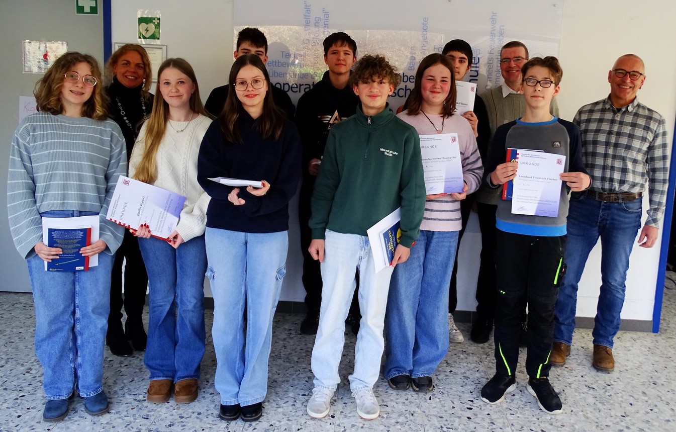 Die Erstplatzierten waren in der Hauptschule Leonhard Friedrich Fischer, Mehmet Akif Basay und Anna Katharina Claudia Ohl; in der Realschule Emilja Dippel, Ben Paule Piecha und Leo Kammer; im gymnasialen Zweig Lenny Nebe, Sarah Carolina Schüerhoff und Jona Marleen Selle.