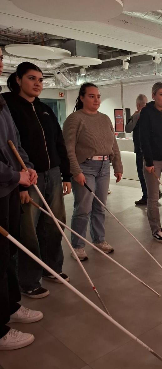 Im Verlauf des Rundgangs verlagerte sich der Fokus zunehmend auf andere Formen der Wahrnehmung. Sprache, Geräusche, Berührungen und Vertrauen gewannen an Bedeutung. Gleichzeitig eröffnete die Erfahrung einen Einblick in die Herausforderungen, mit denen blinde Menschen im Alltag konfrontiert sind, und förderte ein vertieftes Verständnis für deren Lebensrealität.