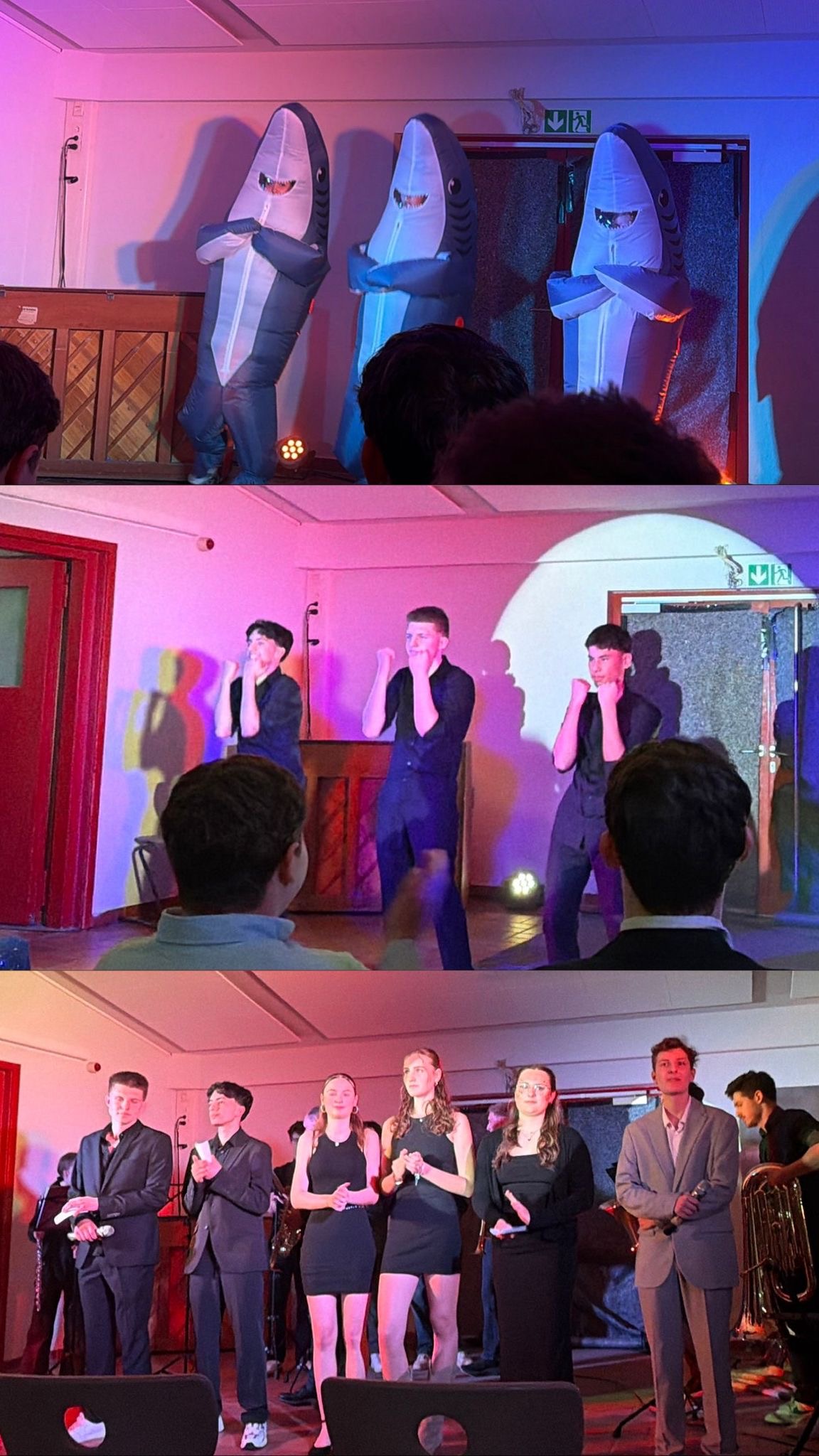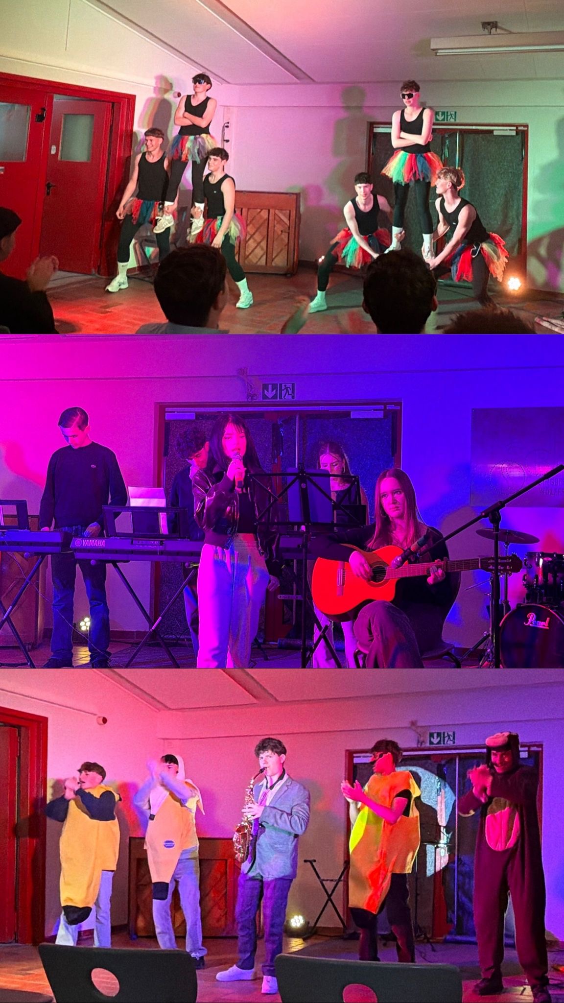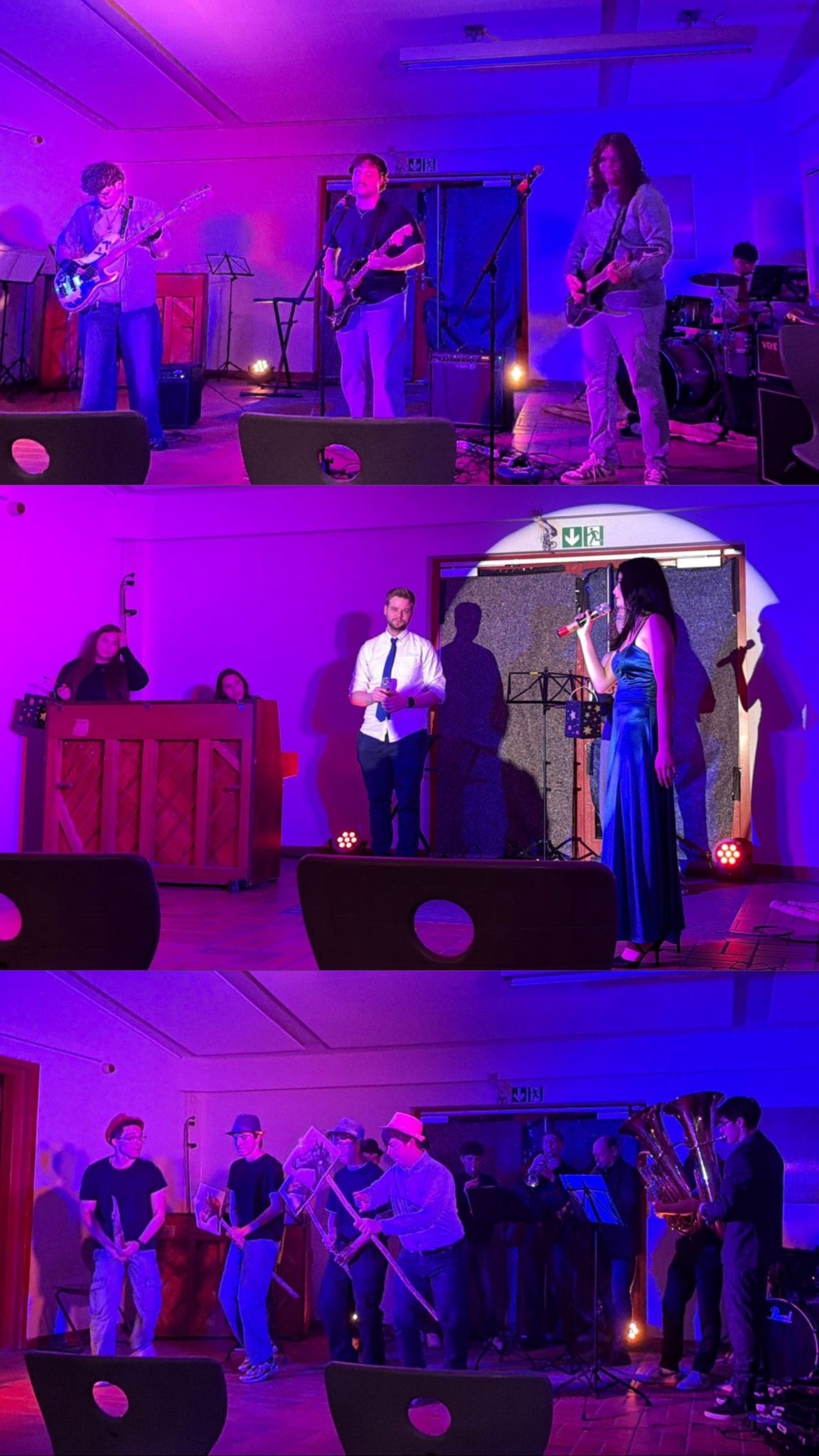 Zwischen den energiegeladenen Tänzen setzten musikalische Darbietungen besondere Akzente: „Rewrite the Stars“ und Cohens „Hallelujah“ wurden von Schülerinnen und Schülern selbst gespielt und gesungen. „Smells Like Teen Spirit“ erklang in einer überraschenden Cello‑und‑Schlagzeug‑Fassung. „Rhabarberbarbara“ sorgte für breite Grinsen im Saal, Benjamin Vogler (10R3) lieferte mit seiner Band einen starken Gastauftritt und „Griechischer Wein“ von Udo Jürgens – samt tanzender Weinflaschen – ließ das Publikum mitsingen und mitwippen. Anschließend ging es beim Klang von „Magnificent Seven“ mit Hobbyhorsing im Galopp weiter.