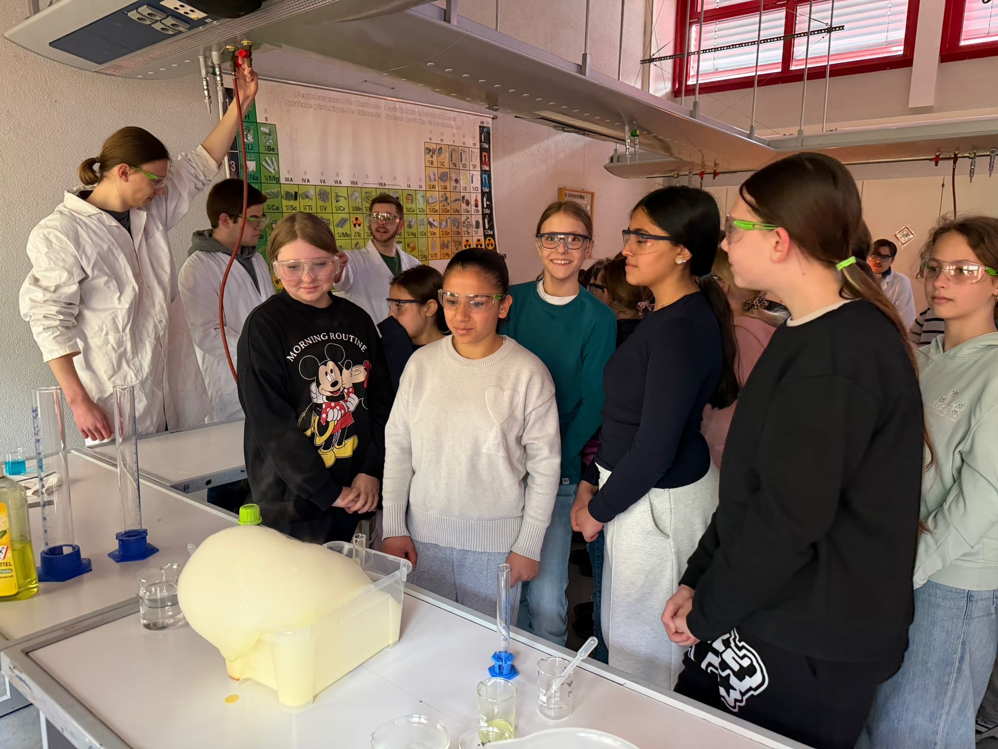Untersucht wurde zum Beispiel die Wirkung eines Katalysators anhand des Experiments „Elefantenzahnpasta“. Dazu wurde eine Seifenlösung mit Wasserstoffperoxid und Iod-Kaliumiodidlösung gemischt. Es setzte eine starke Reaktion ein, bei der viel Schaum entstand und aus dem Messzylinder hinausschoss. Zudem wurde es rundherum auch etwas warm.