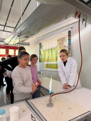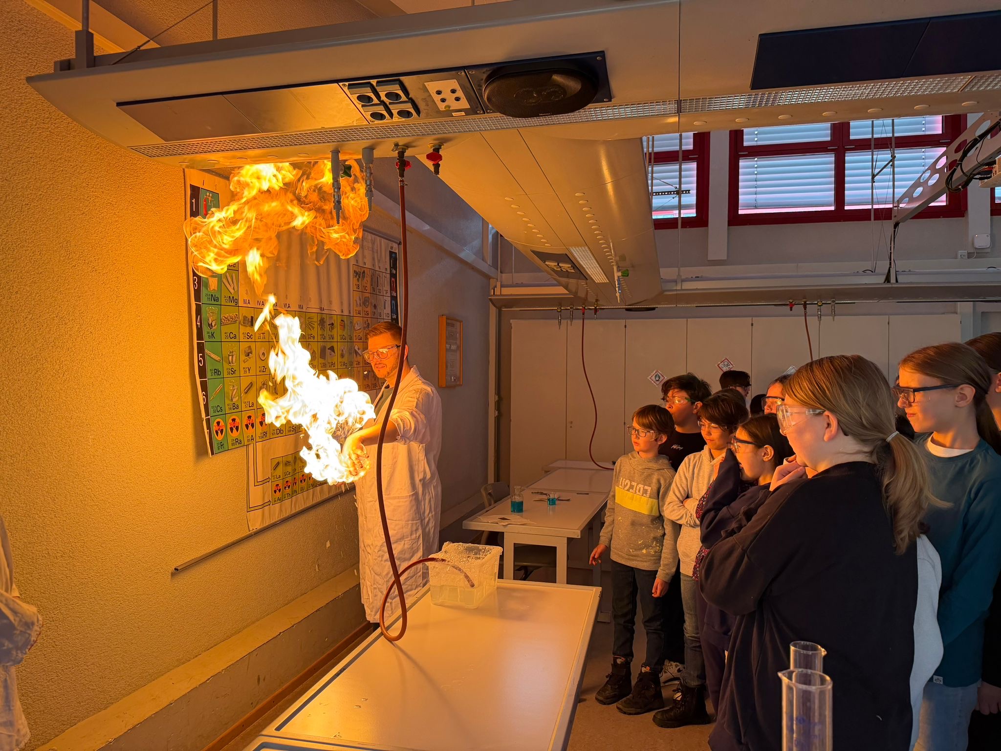 Am Freitag vor den Osterferien eröffnete der MINT-Club zum zweiten Mal. Dieses Mal stellten Schülerinnen und Schüler aus den Chemie-Leistungskursen von Herrn Bönicke spannende Experimente aus dem Fach Chemie vor. Die Lernenden aus der 5. und 6. Klasse staunten nicht schlecht als dabei sogar die Hand des Chemielehrers in Flammen stand.